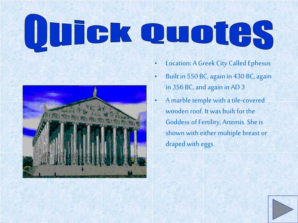 The temple of artemis, one of the seven wonders of the ancient world, once stood 418 feet by 239 feet with over 100 marble pillars each 56 feet high. . Each world has more than 20 groups with 5 puzzles each.